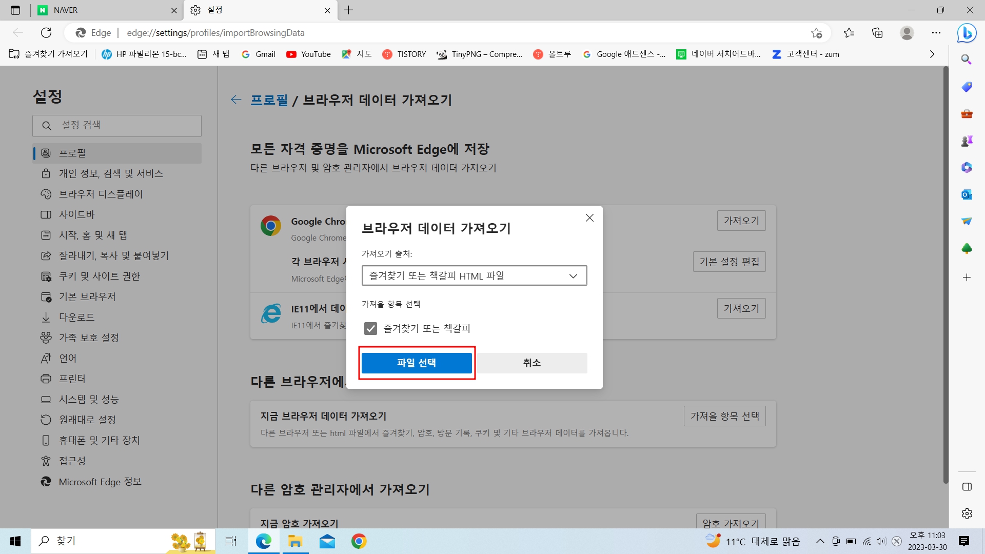 5. 다른 브라우저에서 가져오기 파일선택 클릭