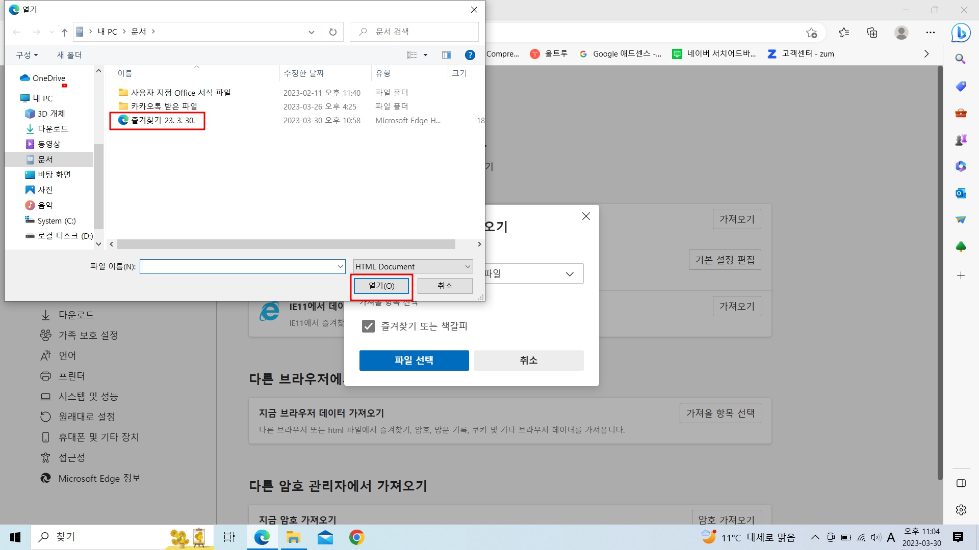 6. 브라우저 데이터가져오기에서 즐겨찾기 또는 책갈피 HTML 파일 선택 후 가져오기 클릭