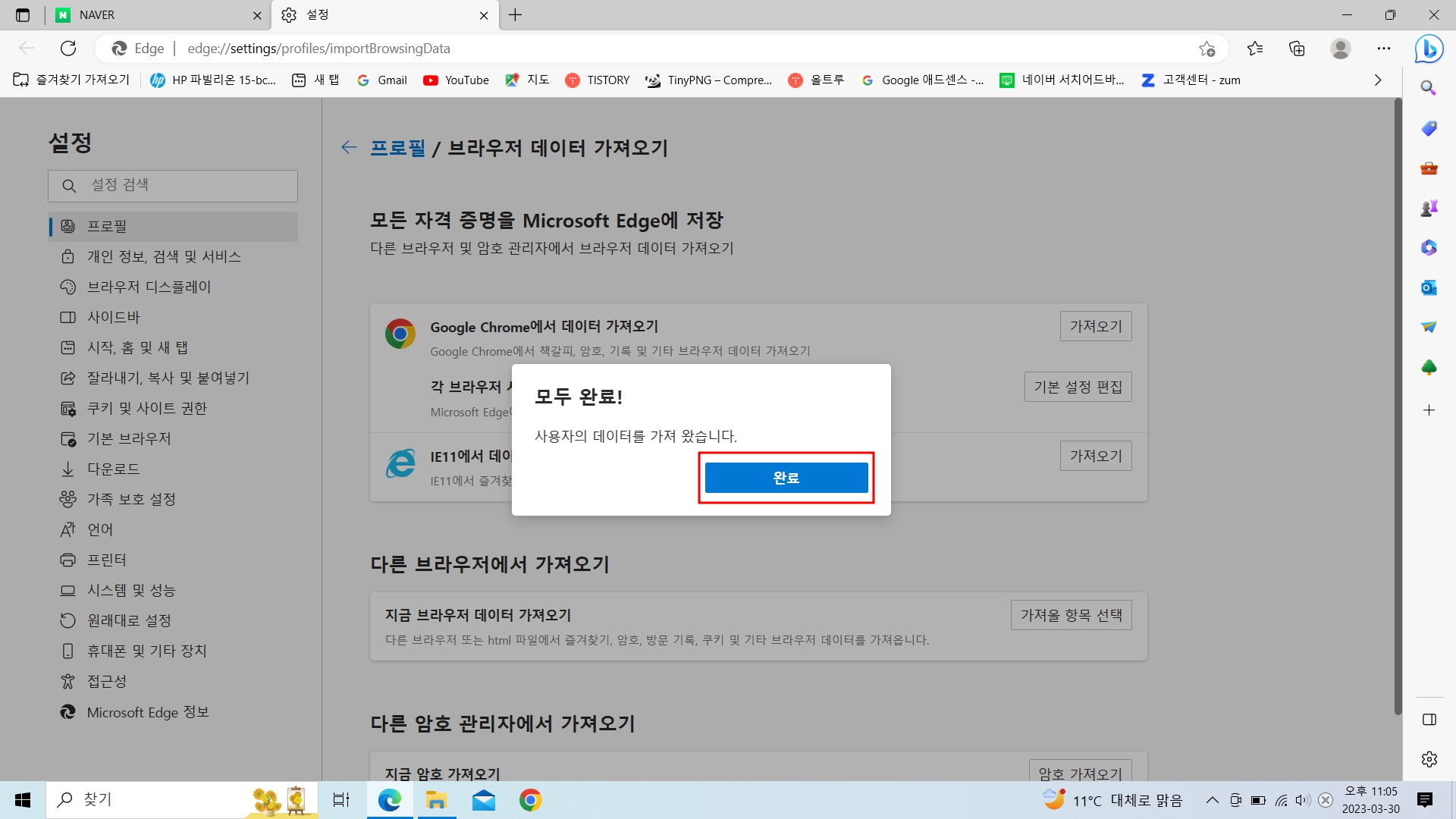 7. 가져오기 완료 클릭 후 엣지 실행하면 즐겨찾기가 생성됐음을 확인하실 수 있습니다.