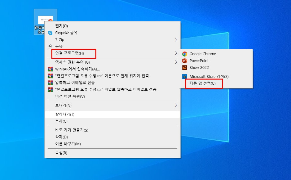 1. 문제가 되는 파일 선택 후 오른쪽 마우스를 클릭 -> 연결 프로그램 -> 다른 앱 선택 클릭