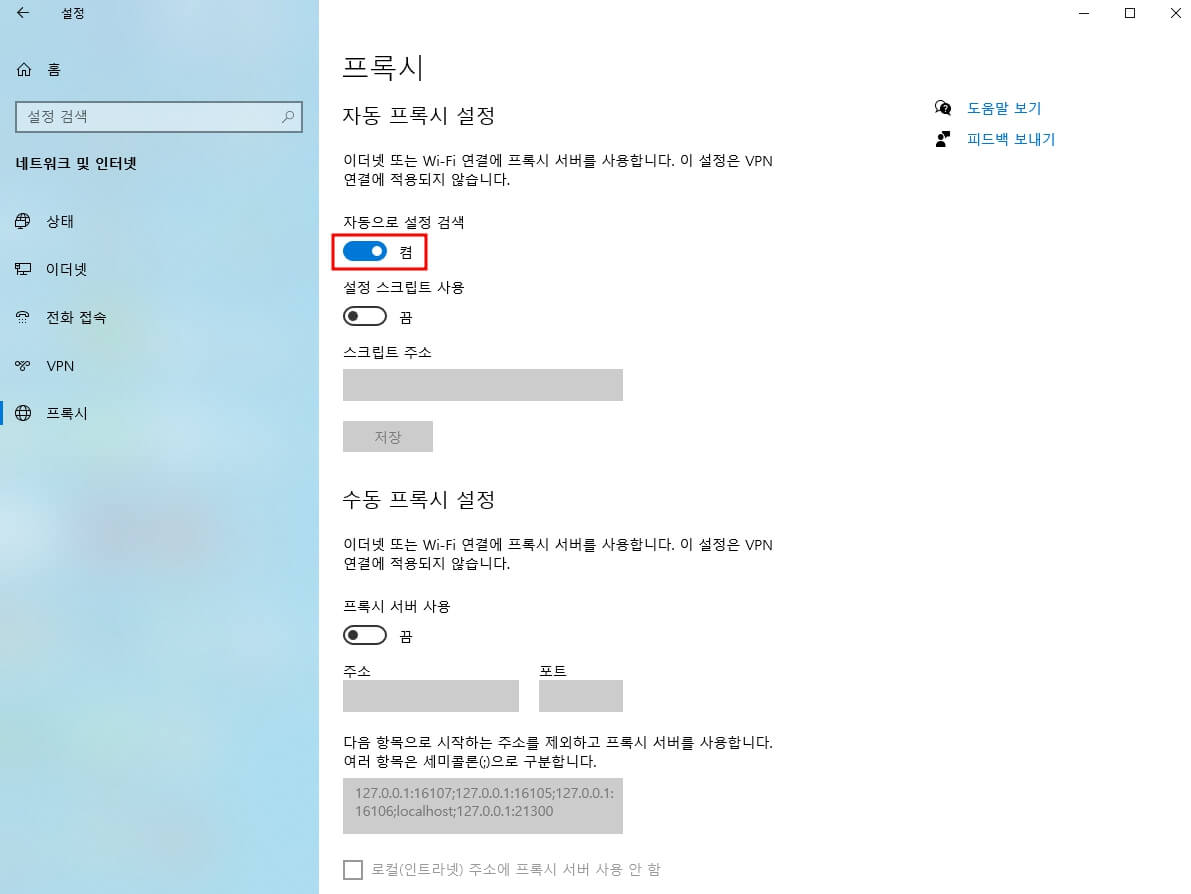 자동 프록시 설정의 자동으로 설정 검색 끔으로 변경