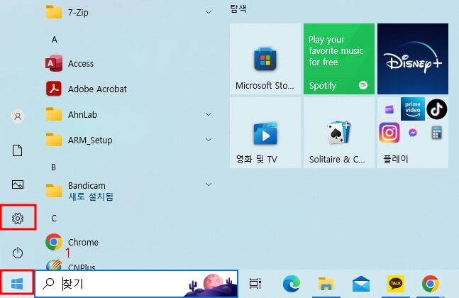 화면의 좌측 시작버튼 클릭후 톱니바퀴 모양 설정 클릭