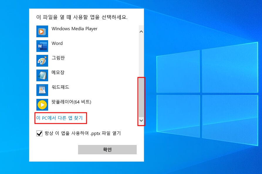 4. 스크롤바를 내려가며 변경하고자 하는 앱이 있는지 확인 후 2번 항목과 같이 항상 이 앱을 사용하여 파일 열기